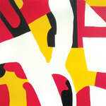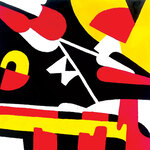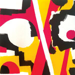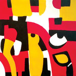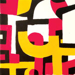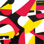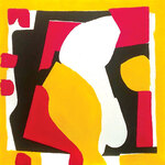 Schilderij opgebouwd uit gekleurde vormen gezaagd uit multiplex, gemonteerd op een drager van multiplex (zwart). Voorzien van hangsysteem aan de achterzijde.